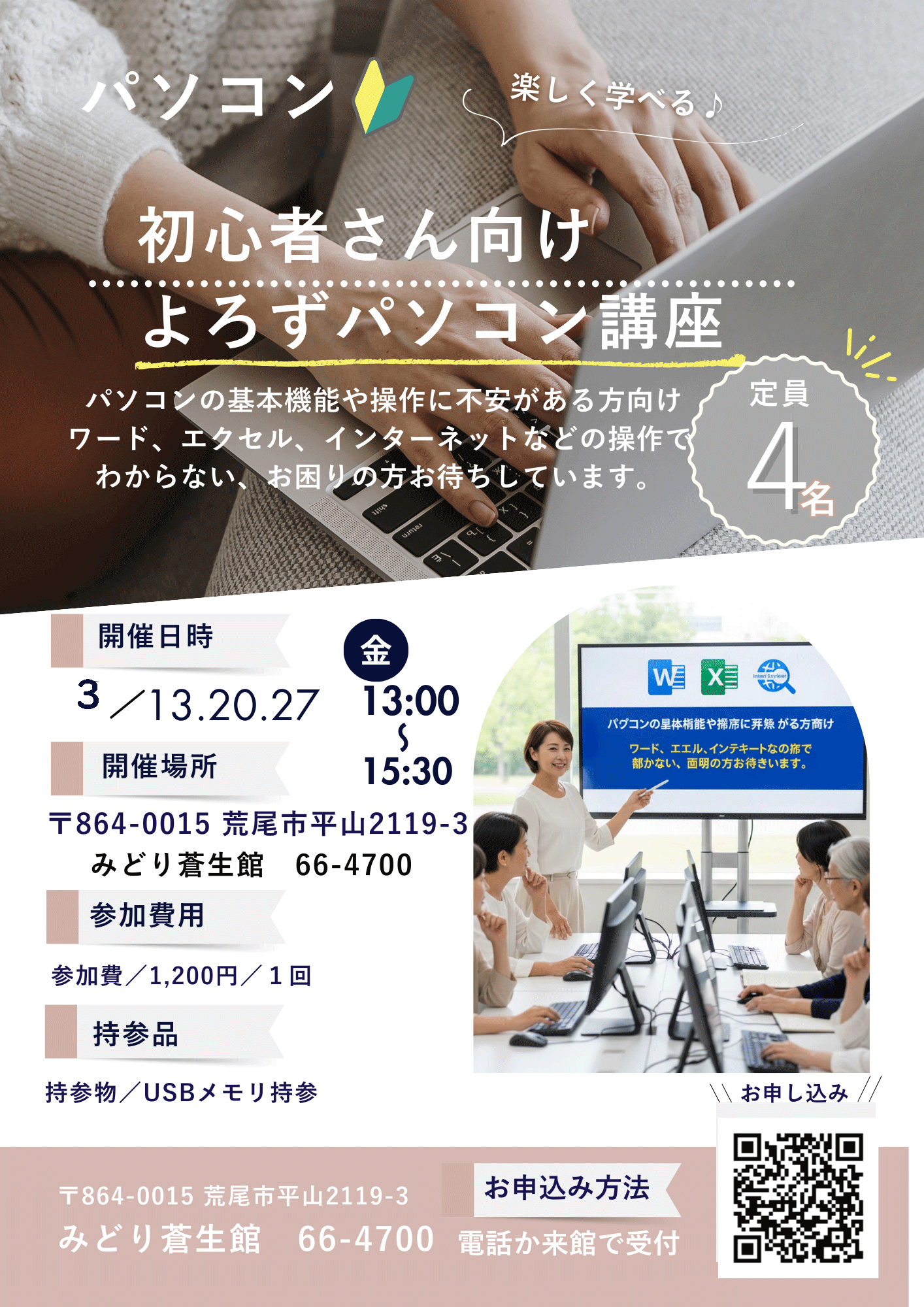 ワード・エクセル・インターネットなど、パソコンの操作がわからない・ お困りという人はぜひご参加ください。 開催日: 7月4日(木)・18日(木) 10:00~12:00 定員 : 4名( どなたでも) 参加費: 1200円/1人 持参品: USBメモリ